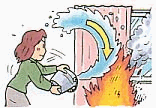 2ストーブや畳などへは一気に かける。ただし、油なべや感電の 恐れのあるものには直接水をかけ ないで、他の方法で消化を。 ![]() |