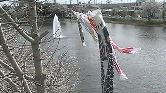 | 昨年五月、子供の日に因んで、初めての試みとして、生実池上空に緋鯉、真鯉の群れ薫風に泳がせ |