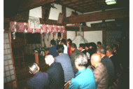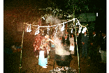 宵宮には、湯立という湯花進献式が執行される。正徳元年(1711)九月三・四日の遷宮式挙行の時、 湯立神楽を奉納しているので、古くから行われていたのであろう。湯立はもともとは探湯(くがだち) という古代裁判の方法のひとつである。式は午後7時ごろから神主、氏子惣代、各組の世話役が神社 に集まって行なう。まず湯立の釜を社前に用意する。口径一尺六寸五分の二斗釜を、八寸角の鉄棒 三本を地面に刺して作った五徳の上に置き、湯を沸かす。神主は熊笹12〜3本を束ねて二把作り、 白紙を細かく切り三宝に山盛りにし、さらに麻を細かく切って混ぜ、この二品を神前に供えて 祈祷をする。笹を両手に持って祈祷をしながら湯を掻きまわし、それから湯の釜の前で、 笹を振りかざし終わると産宝の紙片を散華して式は終了する。この湯を目に付けると眼病が治るという伝えがある。 |