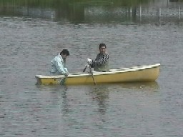 池に落ちている鯉をボートで拾っている