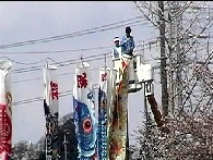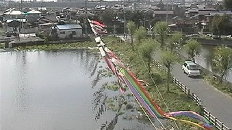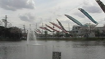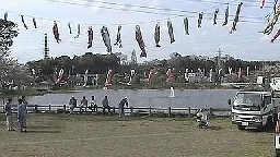 | 昨年五月、子供の日に因んで、初めての試みとして、生実池上空に緋鯉、真鯉の群れ薫風に泳がせ |