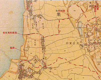 戦国時代の生実城や江戸時代の陣屋土塁跡が描かれている。台地東部は松林、集落周囲は畑、海岸平地は水田です。