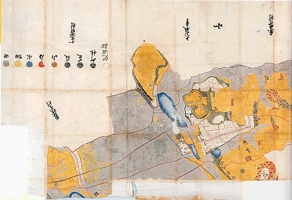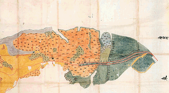 西南部の塩田周辺、南端部長山砦の部分が欠損しているが、北生実村中心部は細部まで描かれている。北生実村は台地上東部に秣場や山林があり、 畑や水田も広く、海面の権利も持っていた。しかし、水田を維持する用水には不足しており、草刈堰(杉山堰)によってはるばる村田川から取水している。 また生実大池に土手を築いて曽我野村へ分水していることから水争いも起きている。 法的には村でありながら、村内には生実藩陣屋が置かれ、藩家臣団が常駐するなど、城下町的性格を持っていた。図からも小集落や町並みが陣屋を 囲んでいる様子がよくわかる。藩主菩提寺を含め七つもの寺院、堂舎があることも注目される。 1800(寛政12)年村高1256石余、家数175件、人数811人、馬51疋。1843(天保14)年の百姓199軒の内102軒は商売や職人家業であった。 |