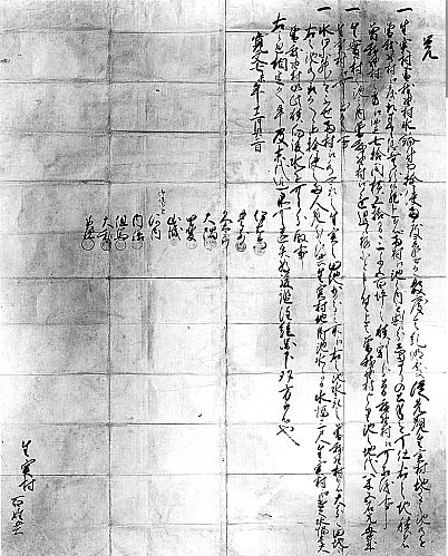 東端中央付近に大弓村(生実村)の家並、北西角に曽我野村の家並が描かれているが、この時この両村が生実池の水をめっぐて争って いる。この争論に対して幕府裁判所ともいうべき評定所がその判断を示したのが本図である。生実池には墨線がくっきりと引かれ、 北側部分に「曽我野方 三千五百坪」と記される。裁判の結果、池の中に仕切りの土手を築き、曽我野分と生実分とに分割 されたのである。しかし池は生実村地内なので、右の処置のかわりに、曽我野村は池の地代として毎年米五石を生実村に支払うことなど が決められた。このように、表に裁許(裁定)の内容を絵図の形で描き、裏に文章を付したものを「裁許裏書絵図」といい、 近世では用水争論や地境論など土地に関係した裁判に用いられた。このような裁許裏書絵図は、近世を通じて作成されたが、 本図は特に十七世紀中頃という早い時期に作成されたものであるため、後に様式が整備された段階とは 異なるいわば過渡的な性格を持っている.まず形式の上からは、「覚」と題されている点、幕府老中・寺社奉行・町奉行・勘定奉行が 署名捺印している点、宛名として「生実村百姓共」とされている点があげられる。今日多くみられる十八世記以降の裁許裏書には、 普通表題はつかず、同一国内の用水争論に老中が署名する例は少なく、また宛名も欠くのが普通である。 また本裏書には裁許内容のみが記されているが、これも後には原告・被告双方の主張内容、検使が現地で調査した内容を記した上で、 裁許内容を述べるという形に整えられていった。こういった裁許裏書絵図は、通常、その地域を支配する領主や幕府代官にではなく、 訴権を有する村に宛てる方式をとった。なお本図は、生実村内の各集落のうち新田・塩田は「大弓ノ内」とされるのに対し、 柏崎は独立村として描かれていること生実池の南、本満寺の向かい付近に生実池に連なる別の池が描かれているなど、 後世に失われた近世初頭の様子を伝えていることでも貴重な絵図である。 |