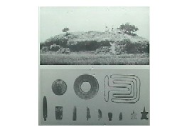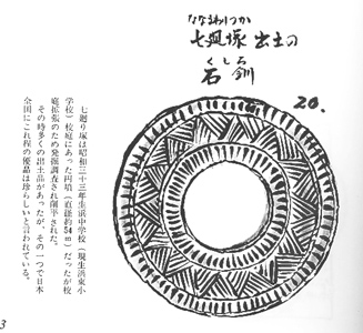 これが七廻塚古墳で五世紀頃に築かれたものと考えられています。昭和三十三年 生浜中学校(現在東小学校)校庭にあったもので校庭拡張の為発掘調査され削平された 鉄製武具や農具のほか滑石製の装飾模造品や青銅製鏡など多くの副葬品が出土しました。 なかでも石釧は、表、裏、両面に幾何学的な模様が刻まれたもので 全国的にもこれほどの優れた品は珍しく,千葉の古代史を探る上で貴重なものとなりました。 その後日本全国の関係機関に巡回調査され現在は国の所有となり、 千葉市埋蔵文化調査センターに保管されています。 |
