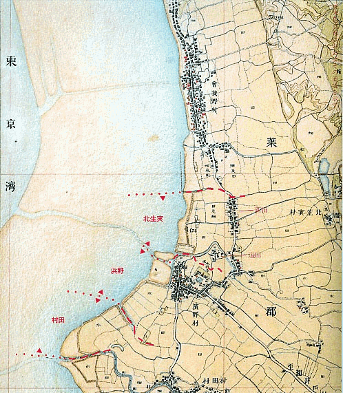 ほぼ海岸に沿って南北に走る道路(房総往還)に面していくつかの集落がみえる。このうち曽我 野村と浜野村との中間に位置する集落は、北から生実新田.塩田と呼ばれ、行政的には北生実 村の中に含まれていたが、独立性の強い沿岸集落であった。またこの図では、沖から浜野村や 曽我野村へ向けて、遠浅の海岸に船を乗り入れる為に掘られた澪(みお)が長く伸びているのが 眼を引く。近世以降、鉄道が整備される明治中期までの間、浜野・曽我野からは江戸・東京など に向けて盛んに船が往復し、両地は房総半島各地の物資が集散するターミナルとして賑わいを みせた。一般の漁船よりも大型の五大力船が、あるいは江戸の流行をいち早く取り入れた日用品 を積み、あるいは房総産の米や魚肥を満載して、この澪を行き来していたのである。 |