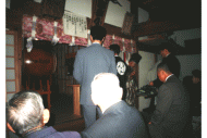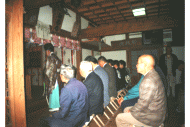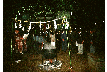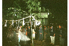 宵宮には、湯立という湯花進献式が執行される。正徳元年(1711)九月三・四日の遷宮式挙行の時、 湯立神楽を奉納しているので、古くから行われていたのであろう。湯立はもともとは探湯(くがだち) という古代裁判の方法のひとつである。式は午後7時ごろから神主、氏子惣代、各組の世話役が神社 に集まって行なう。まず湯立の釜を社前に用意する。口径一尺六寸五分の二斗釜を、八寸角の鉄棒 三本を地面に刺して作った五徳の上に置き、湯を沸かす。神主は熊笹12〜3本を束ねて二把作り、 白紙を細かく切り三宝に山盛りにし、さらに麻を細かく切って混ぜ、この二品を神前に供えて 祈祷をする。笹を両手に持って祈祷をしながら湯を掻きまわし、それから湯の釜の前で、 笹を振りかざし終わると産宝の紙片を散華して式は終了する。この湯を目に付けると眼病が治るという伝えがある。 |